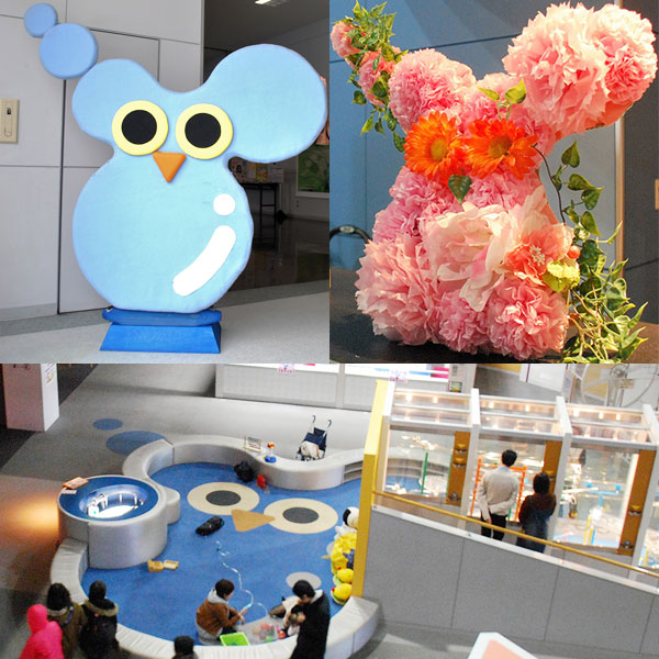 旭川市科学館サイパルのコロッ・クルは、地球上初の生命・単細胞が集まる様子がモチーフ。そこに、欧米では学問の神様として、アイヌの人たちからは森の守り神として敬愛されるフクロウを組み合わせています。名前はアイヌ伝承に登場するコロポックルから。プラネタリウム投影に出てきたり、キッズスペースにだって、ほら。受付のお花はスタッフのお手製です。/旭川市科学館サイパル