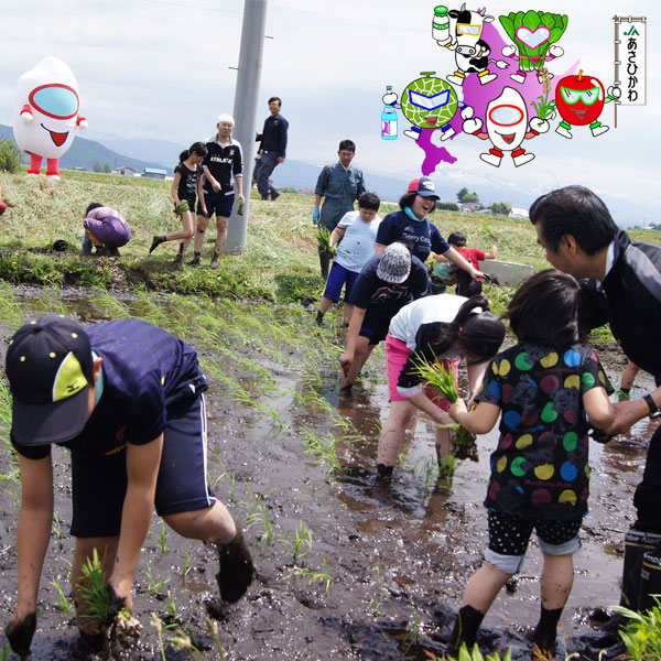 JAあさひかわ戦隊アグレンジャーは、水田守(みずたまもる)、ベジー、アポー、メロ助、ミルクンの5人から成るヒーローです。JAあさひかわの主要農産物がひとめでイメージできるものを農協内で公募し、名前はみんなで考えたそう。力を合わせてがんばれ!アグレンジャー!写真は、田植え体験を見守る水田守。/あさひかわ農業協同組合