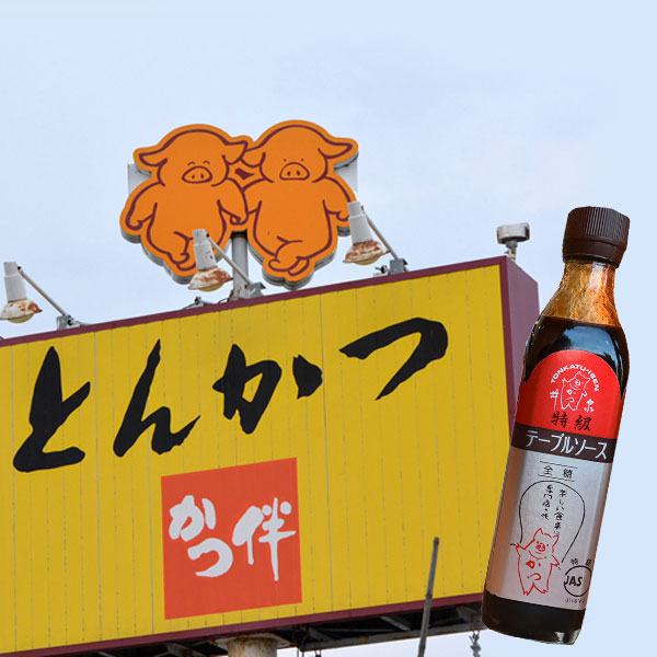 いたいた、井泉のぶた。全国的にもお馴染みのマークは、井泉本店(東京)の二代目が考案したもので、昭和47年に暖簾わけで来旭。かつ伴の豚さんはもちろん旭川のオリジナル。特に名前はないけれど、2月9日(にくの日)生まれで恥ずかしがりや。だから、だいたい背中を見せているんです。2匹の関係は曖昧ですが(そういう意味じゃなくて!)、2匹の理由は「親子でも友達でもカップルでも、みんなで食べに来てもらいたいから」と社長の伴野さん。/かつ伴
