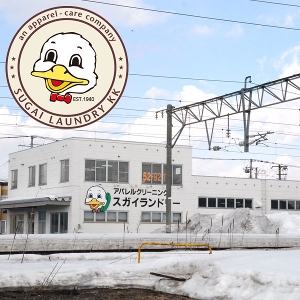 旭川を拠点にクリーニングやユニフォームレンタルを手掛けるスガイランドリー株式会社は、1940年創業。1971年、先代(現会長)が当時業界の先端を走るアメリカでの視察で企業のキャラクターロゴに感銘を受け、すぐに地元の絵描きに発注。店舗の看板やセールのチラシ、集配車にもこのアヒルを使っています。当時からリタッチや修正をかけていないので、なんともいえないレトロ感がそのまま残っているんです。 「1971年はマクドナルドが日本に進出した年。当時の日本は、菓子メーカーなどではキャラクターが使用されていましたけど、サービス業ではあまり例がなかったと思う」と振り返ります。「私は、会社や店の看板、特に旭川の場合は車が街の景観における一部だと思っています。今回のような企画が市内の企業に浸透し、店の看板や業務車両がより華やかになって、街を明るくしてくれたらいいですね」。/スガイランドリ―株式会社