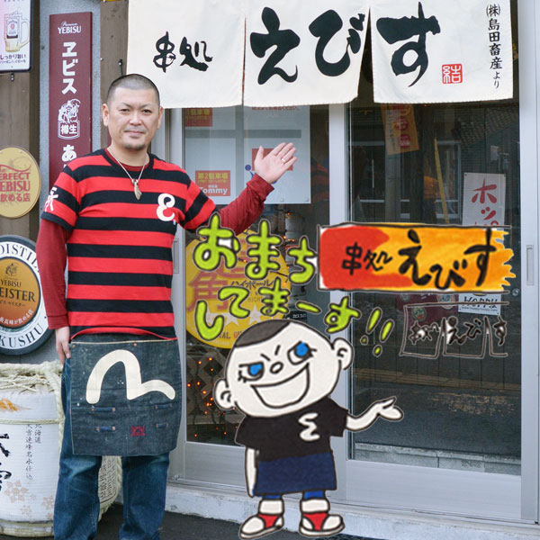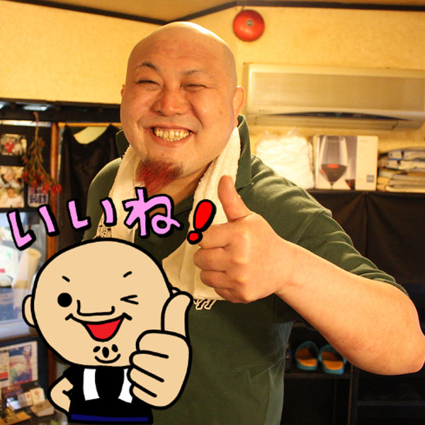 マスター佐藤結城さんをイメージしたLINEスタンプ。「120円です。串3本サービスしますので、買ってね~」。実写のほうが圧倒的に怖いな・・・(いい人だよ!)。/串処えびす