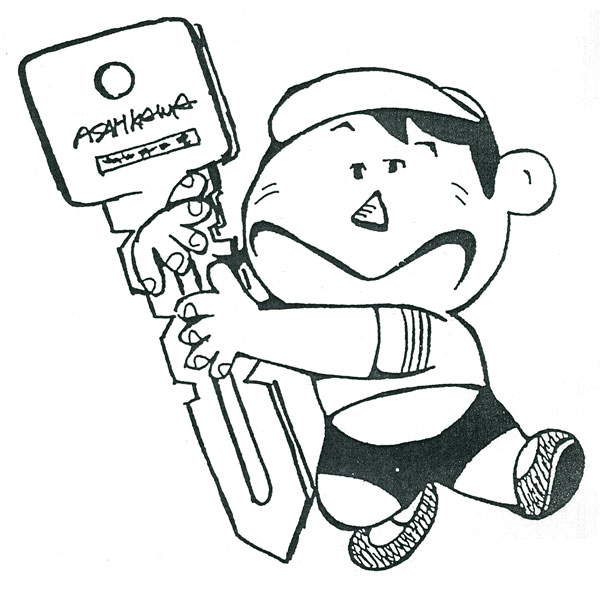 「鍵って堅いから、やわらかなイメージにしたくてね」と40年ほど前、タウンページの広告から誕生したキーロックのキーボーイ。モデルは社長、命名も社長。「ラッキーボーイに引っ掛けたんだ」。/キーロック旭川