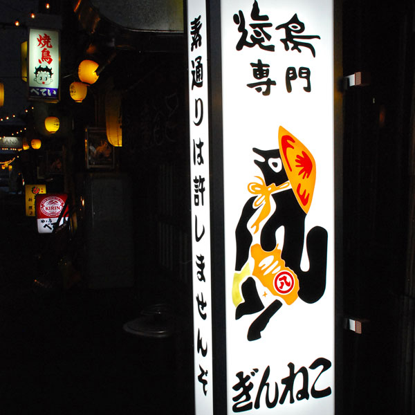 反射的にのれんをくぐってしまうのは、飲兵衛の性・・・。創業時から縁起物として店内に飾っていた信楽たぬきが、今は看板に。愛嬌ある姿から、たぬきの近くの席は「たぬきの2番さん」などと店員の隠語になっていたそう。あ、お隣にベティちゃんも発見しちゃった。/焼鳥専門ぎんねこ
