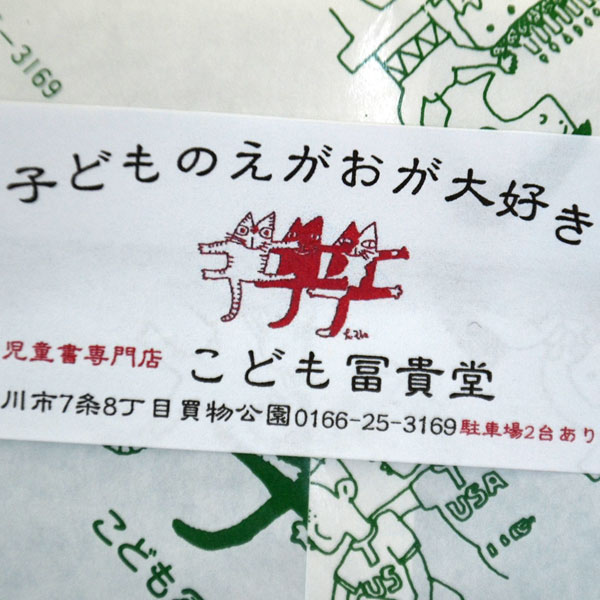 こども冨貴堂の包装紙として、旭川の絵本作家・あべ弘士さんが描いた三匹の猫。「もう30年以上前のことだけど。可愛いので名刺やシールにも使わせてもらっています」。ホームページでは動いていて、その揺らぎは目の錯覚かと思うほど小刻み・・・。名前はありますか?の問いに「吾輩は猫である。名前はまだ無い」とおばちゃん店員。/こども冨貴堂