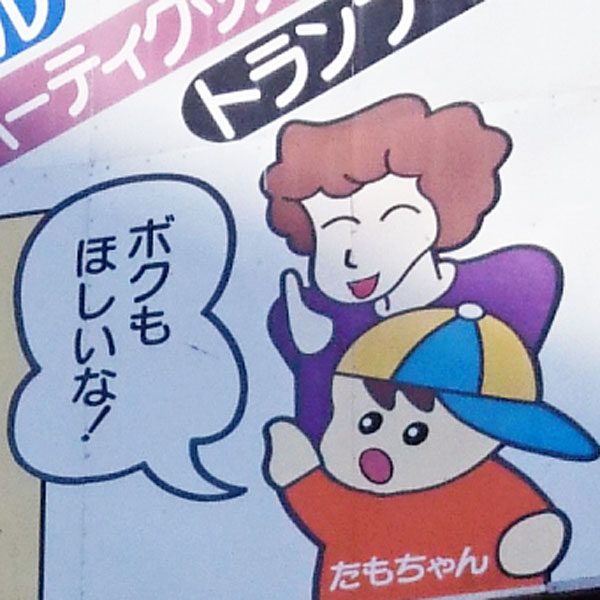 3条買物公園、おもちゃのたもちゃんの看板。おもちゃを欲しがっているこの子こそ、きっと「たもちゃん」なのでしょう。最初はミッキーとドナルドが描かれていましたが、「さすがにディズニーはまずい」ってことで上から描き直~し!結果、ママはクレヨンしんちゃんのみさえ風に仕上がりました。/おもちゃのたもちゃん