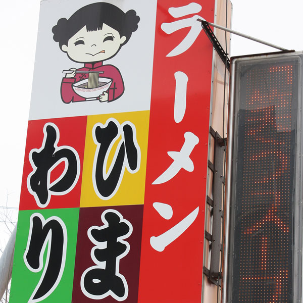 ベロ出して、おいしそうな顔して!ラーメンひまわりのひまわり娘は、1987年の創業時「子供たちに楽しくラーメンを味わって欲しい」と看板屋さんに描いてもらって誕生。当時はパネルなどにも貼ってありましたが、現在はこの外看板のみに描かれているキャラクター。まさしく正真正銘の看板娘なのです!/ラーメン専門ひまわり大雪通本店