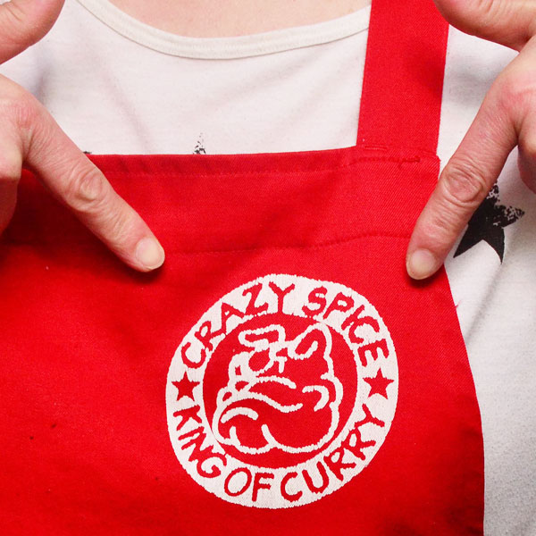 人気カレー店・クレスパのロゴにあるウネウネは、よーく見るとブルドッグ。大の犬好きである店主斉藤さんが描きました。「オープンからずっと一緒なので、店と同じ22歳。犬にしたら長生きだね」。このクレイジードッグはケータリング車にも大きく描かれていて、1日に2回見たら幸せになれる都市伝説もあるんです。/クレイジースパイス