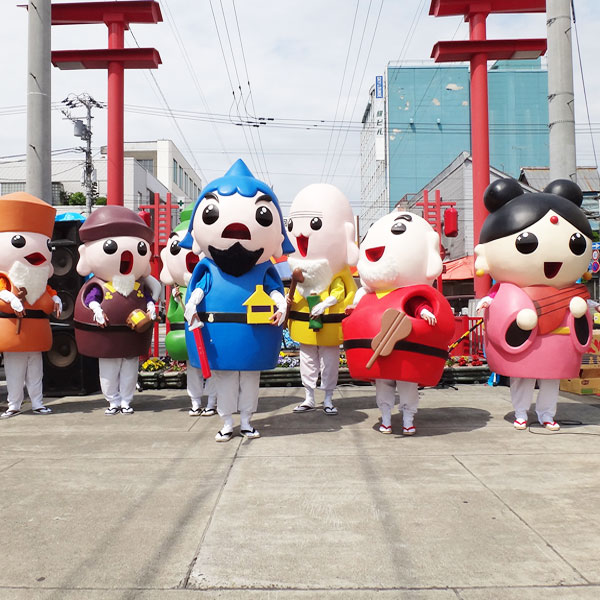 15丁目、銀座商店街の守り神セブン。商店街の一角には弁財天を奉伺する弁天神社や七福神のお地蔵様、さわると商売繁盛や長寿延命など、ご利益にあずかれるおさわり七福神もあります。5年ほど前には着ぐるみを作成。キャラの手があるのに、中の人の手も横から出ているという千手観音のようなデザインが銀座らしい。/銀座商店街振興組合