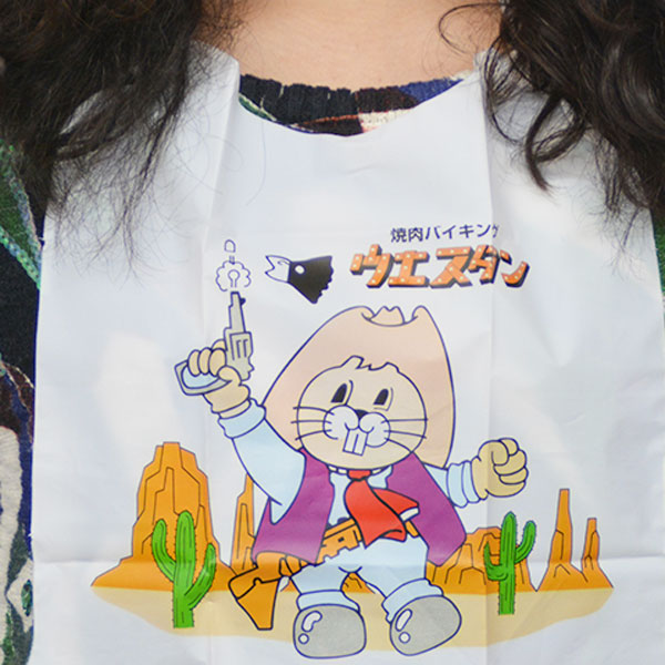 スタッフは、専務とか常務とか呼んでいる、焼肉バイキングウエスタンのビーバーくん(たぶん)。看板、メニュー、子供用の前掛けに出没。/焼肉バイキングウエスタン