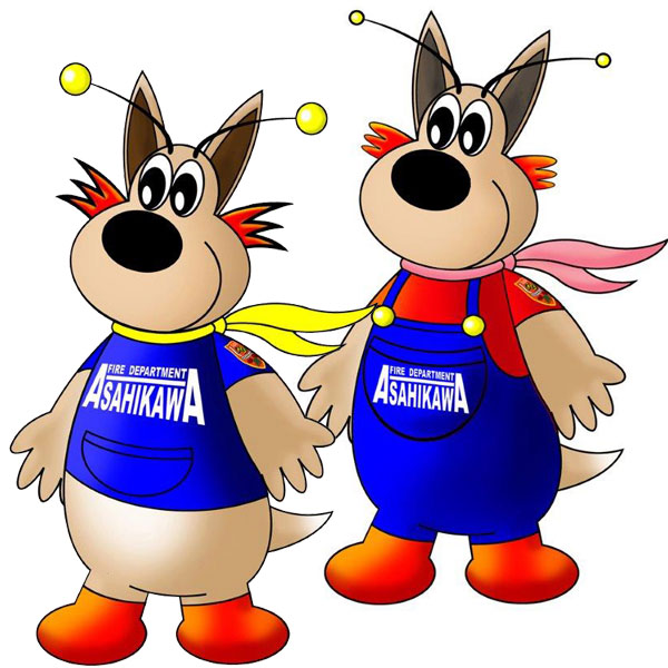 旭川を安全で安心して暮らせる街にするため、未来からタイムスリップしてきた消防犬のホットくんとラインちゃん。頭じか生えのアンテナで火災危険や事故、救急を察知するのだわん。/旭川市消防本部