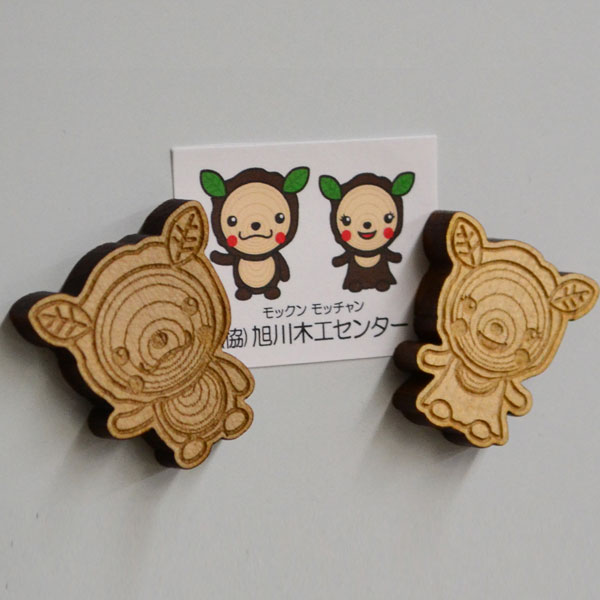 協同組合旭川木工センターの誕生50周年を記念し作った「モックンモッチャン」。切り株に葉っぱのお耳、赤いほっぺがチャームポイント。兄妹ともに、顔には美しい年輪が刻まれています!/協同組合旭川木工センター
