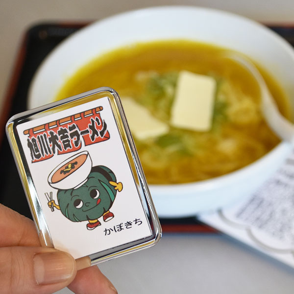 大吉ラーメンでは4年前、新メニュー「かぼちゃラーメン」販売時にノリでつくった「かぼきちくん」がいます。頭にがっつりラーメン置いて、奇跡の安定感。全10種類も作っちゃったマグネットは意外と売れるそう(笑)。ちなみに、ヨーグルトラーメン推しのキャラクター「ぐるちゃん」もいます。/大吉ラーメン