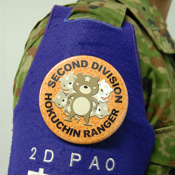 額に光るのは桜の紋章。北方の安全と平和を守るために集まった秘密結社「北鎮レンジャー」は、陸上自衛隊第2師団のキャラクターです。北国で鍛えあげた5人のクマは選りすぐりのエリートらしいのですが、北島三郎の追っかけが趣味の緑=萌黄 (もえぎ)、たいていのオスが落ちる上目遣いが特技というピンク=桜、熊っ子ラーメンが好物の青=空など、マニアックな設定に驚きます。イベントでは隊員手作り(似合わないよね~)の缶バッジやグッズがずらり並びます。/陸上自衛隊第2師団