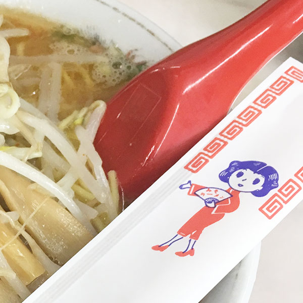 朱色のチャイナドレスがよく似合う、よし乃のあの娘さん。漫画のような看板デザインにしたいと創業時に作ったキャラクターで、「3~4頭身のバランスがかわいいんだ」と社長、溺愛!モデルもいないし名前もないし(よし乃さんではありません)、「たぶん中国人かな」くらいのゆる設定。来年50周年を迎える看板娘は、立ち姿ほか数パターンがありますが、座り姿がお化粧濃いめで色っぽい。/みそラーメンよし乃