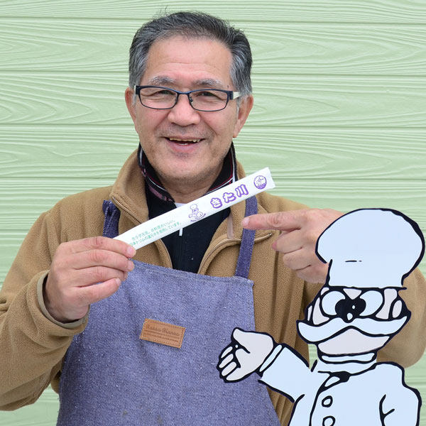 手づくり惣菜や日替わり弁当の仕出し屋「きた川」。25年前の開業時、「名前だけじゃ寂しいべ」って社長の北川末雄さんが自ら描いたキャラクター。「俺に似てるべ?」って、本当にこんな髭生えてたの?/きた川