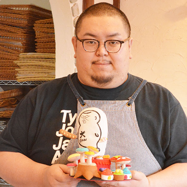 あっちこっちに「大パンマン」。「種類的には妖精。ちっさいおじさん的なやつ。沖縄で言うキジムナーみたいな存在。いいことをしたら手に持っているフランスパンをくれるし、悪いことをしたらフランスパンで思っきり叩かれる」って、マジですか。オーナー桐生大輔さんが適当に描いた自画像がかなり繁殖しています。実写版・大パンマンは、ガラスの向こうの製造スペースによく出現するよ。/みんなの大パン