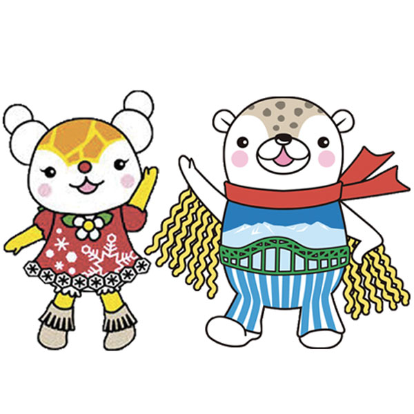 旭川のハッピーを願うヒーロー「あさっぴー」は、憧れのホッキョクグマに変身したゴマフアザラシの男の子。あさっぴーの幼なじみ「ゆっきりん」は、大好きな旭川の雪と融合したキリンの女の子。あさっぴーは袖にラーメンを、ゆっきりんはブーツに江丹別そばを〝フリンジ〟として着こなしている。二人ともフリンジ好き・・・。/旭川市