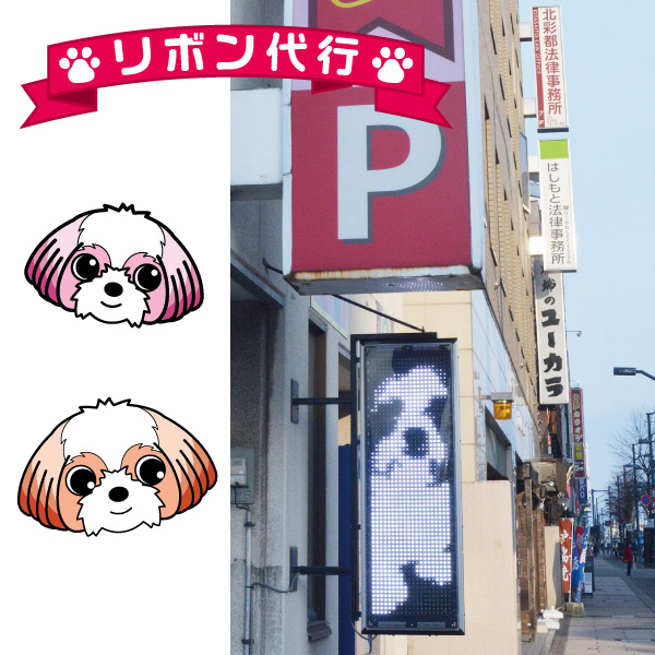 リボン代行の社長は大の愛犬家。シーズーのリボンくん(オス)を飼っています。社名もキャラも、リボンリボン。2匹いるけどどっちもリボン。リボンのほかに、プリンとメロンも飼っているのにリボンリボン。「3文字で語呂がよく、最後にンがついて濁音が入る言葉を探した結果、リボンとなっただけなのだ!」と愛犬家すぎる社長。はっ!電光掲示板にまで、うわっ!リボン!!! /リボン代行