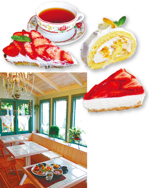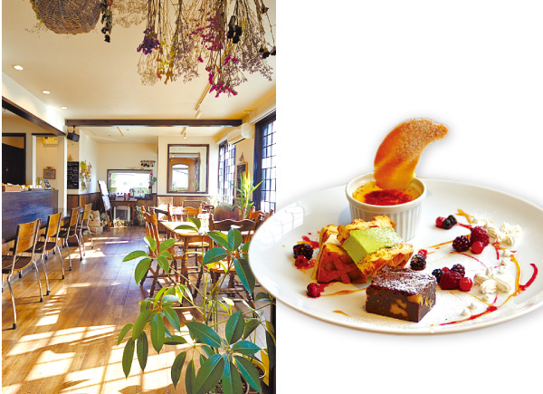 田園地帯を見渡す自然に囲まれたリノベーションカフェ。アンティーク調の家具や小物がずらりと並び、手作り感いっぱいの空間です