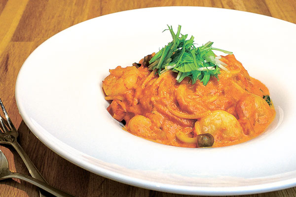 海老を贅沢に使った人気No.1メニュー「海老のトマトクリームソーススパゲティ」(1,000円税別)。アサリのブロードが利いた濃厚なソースが絶品