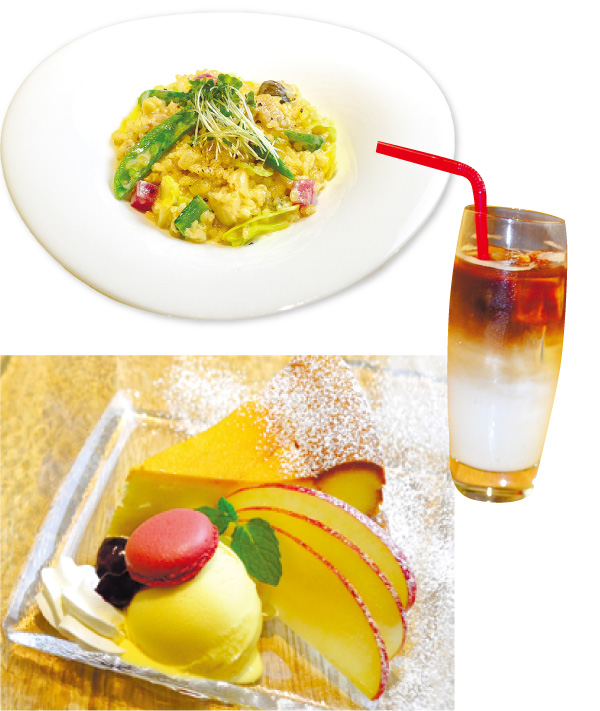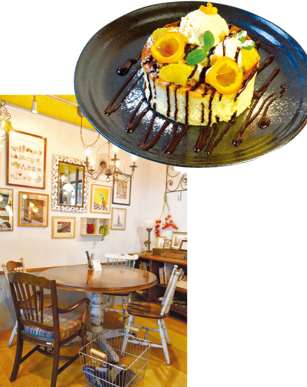 人気は2週間ごとにメニューが変わるアメボランチプレート(1,080円)。26日までは「ふわとろチーズオムライス&オニオンスープ」を提供しています。ソファ席もあるから食事をしながらゆっくりと会話を楽しめるのが魅力。食後は併設のスイーツショップに立ち寄って♪