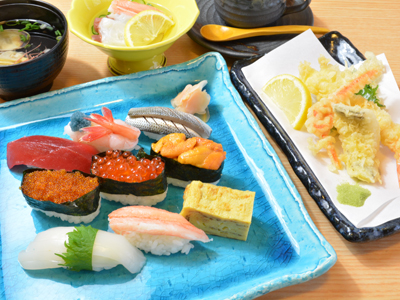 キラキラ光る鮮度抜群のお寿司と、サックサクの海老やホクホクのあなごの天ぷらが味わえる「特鮮すし久ランチ」はちょっぴり贅沢でお得なセット。マグロやウニ、イクラなど全8貫、季節の酢の物とお吸い物付。仕入れ状況でネタが替わるのでお楽しみに。ほか、ランチメニューは税別800円から。