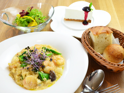 セットには、ドリンク、スープ、サラダ、スペシャルデザート付き。スペシャルデザートも毎月変わるのでお楽しみに。お手頃価格は週替りランチ(850円)もあります。リゾットはディナータイムでは単品で提供しています。