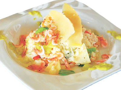旬の食材をふんだんに使った特別なセット「スペチャーレランチ」は毎月内容が変わります。5月のメインは桜エビとタケノコのリゾット。旬を迎える桜エビ本来の味を味わってもらいたいと塩ベースのあっさりとした味つけに仕上げています。タケノコのシャキシャキ食感が楽しい、春らしい一品です。