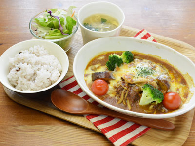 - カレー煮込みの焼きチーズハンバーグ1,188円(ご飯、サラダ、スープ付き)