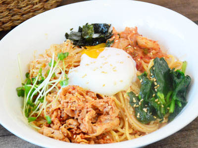 一年を通して冷製パスタも選べますが、暑い夏には特に人気。この夏の新メニューは、じんわりあと引くピリ辛がクセになる、冷たい豚キムチ。キムチパスタに豚キムチ、ナムル、カイワレなどをたっぷりのせた夏バテにもぴったりなガッツリメニューです。温玉を絡めて食べるとマイルドな味わいに変身するので二度楽しめます。平日のランチセットは、ピザ&サラダ付きで900円〜ととってもお得です。