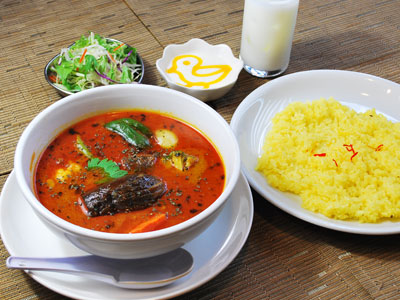 人懐っこい笑顔で出迎えてくれる、ネパール人オーナーのカリー専門店。10種類以上あるカリーと好みのナンやライスを組み合わせて楽しめるほか、サラダやデザート、タンドリー料理が一緒に味わえるセットメニューも豊富です。もちろん、プレーンナン・ライス・サフランライスはおかわり自由!スープカリー(写真)や自家製チーズをたっぷり入れたほうれん草やグリーンピースのカリーなど、新メニューもお目見え。小さな子どもも食べられるように辛さは4段階から選べ、お子様セット(小学生以下のお子様限定)もあります。小上がりのある店内は家族連れに人気。カリーやナン、タンドリー料理はテイクアウトもでき、電話で注文すれば待たずに受け取れます。