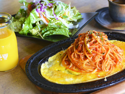 - とろ~りチーズと卵が優しく包む 鉄板オムナポリタン1,280円(ドリンク・サラダ・デザート付)