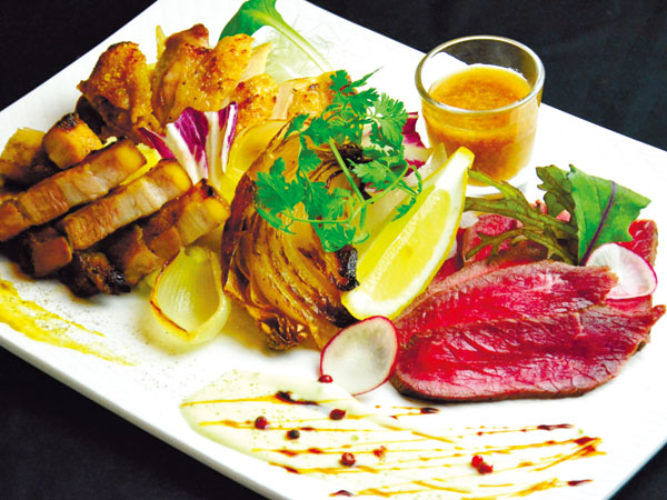 呑んべぇを感激させたくて…「居酒屋の肉盛り合わせ(2~3名セット)」が登場!絶妙な火入れで柔らかに仕上げた「道産牛のローストビーフ~西洋わさびのソースで」、備長炭でじっくりと焼き上げる「知床鶏の炭焼き~特製味噌ダレで~」、脂の甘味が広がる旭川産いも豚を使用した「いも豚チャーシューの厚切り炭火焼き」の人気メニュー3つを一皿で愉しめます。