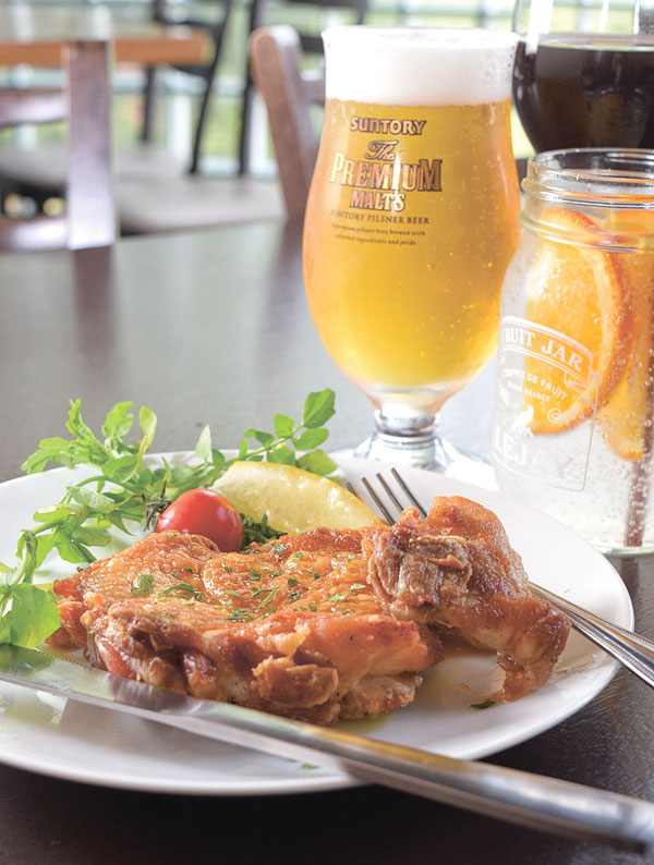 日本庭園の東屋で、乾いた喉を爽快な泡で潤して