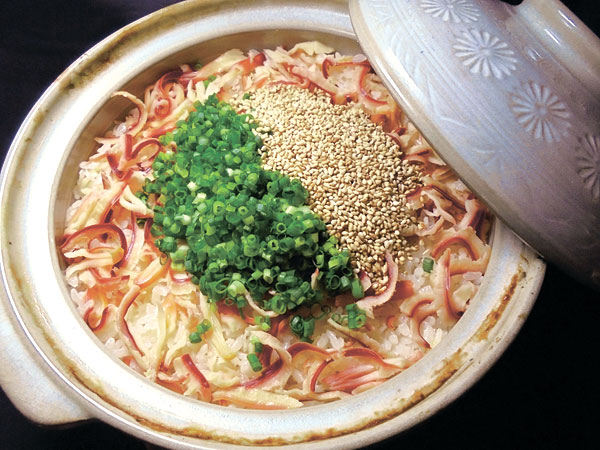土鍋で作るホッキの炊込ご飯(1,980円)は3人前のボリューム。干したホッキを使うことで、旨みをギュッと凝縮し、深みのある味わいに。
