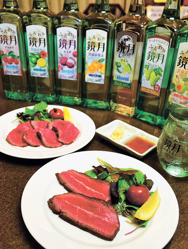 焼鳥店ならではの炭火で仕上げたローストビーフは、柔らかで香りもよし。特上の牛肉を使用した〈上〉は厚切り、通常のローストビーフは薄切りか厚切りから選べます。桃、白ぶどう、みかんなど11種類から選べる鏡月とセットでどうぞ。