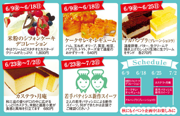 米粉のデコレシフォンとケークサレは18日(日)まで、プレーンとショコラ2種類のアルハンブラは25日(日)まで、23日(金)から7月2日(日)まではカステラと若手パティシエのケーキを販売します。