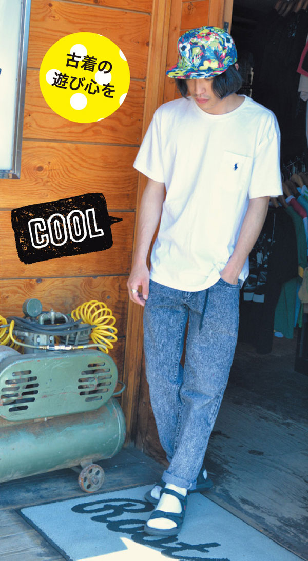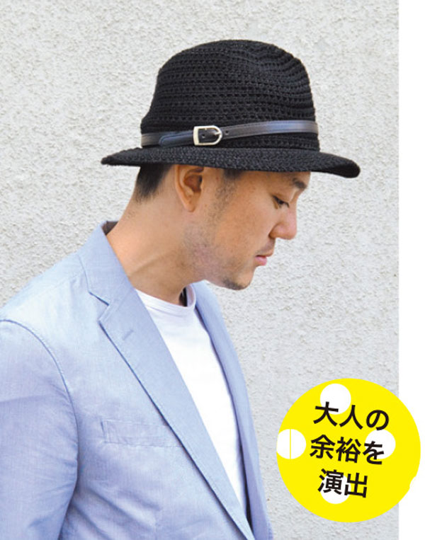 軽い素材の黒ハットは、きれいめにも、ラフなスタイルにも万能。Tシャツ&ジャケットに合わせて、抜け感を出して