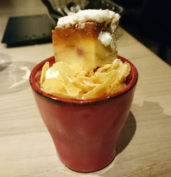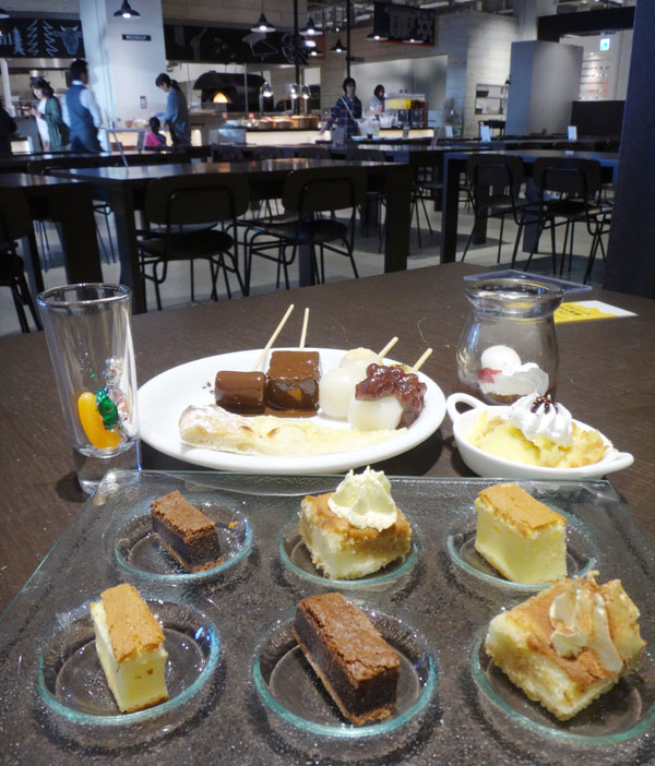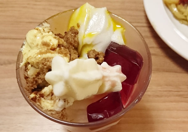 デザート、フルーツが20種類以上、チョコファウンテンや定番スイーツも豊富だ。フルーツは熟していて甘みたっぷり、外れがない。ここでもオリジナルの一品を!とソフトクリーム+ココナツプリン+ワインゼリー+ティラミスでミニパフェを作った。もう止まらない。