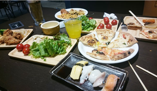 お寿司のコーナーでは、注文するとすぐに握ってくれた。ちらし寿司といった和食から、水餃子などの中華、ピザやグラタンなど洋食まで、とにかくラインナップが多彩。私が気に入ったのは、ピザと並んで鎮座するお好み焼きだ。ふわふわとした食感に、かつお節やソースが良く絡んで何枚でも食べてしまいそう。大好物のから揚げもあっさりとした味付けでどんどん腹に吸い込まれていった…。