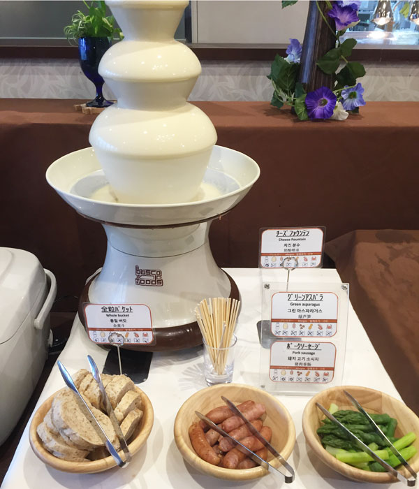 チーズファウンテンでは、アスパラやソーセージをチーズでコーティング。子供にも大うけだ。
