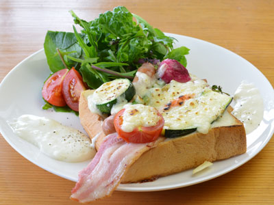 緑の中にひっそりと佇む同店では、美瑛産の食材をふんだんに使った料理が味わえます。オススメはオーブンでじっくり焼いたクロックムッシュ。厚さ3cmの食パンに、美瑛豚のソーセージやベーコン、自家製のローストポーク、新鮮野菜をたっぷりのせた大迫力のボリュームです。素材の味を邪魔しないよう濃厚さをおさえたベシャメルソースは、軽い口あたりながらもまろやかな味わい。チーズの香ばしさと外はサクッと中はふんわりとしたパンの食感が食欲を掻き立てます。その日仕入れたみずみずしい野菜をサラダに添えたワンプレートランチはプラス200円でスープがつけられます。