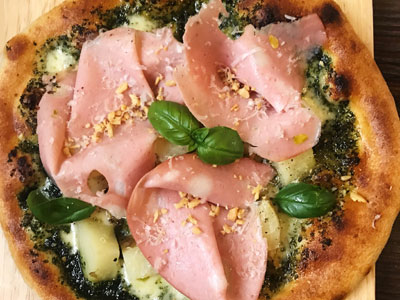 ランチ限定、今月の8インチピザ「リグーリア」は、夏の太陽をいっぱいに浴びて育ったバジリコをふんだんに使用したこの季節だからこその味わいです。イタリア、ボローニャの大判ソーセージ「モルタデッラ」とジャガイモをたっぷり乗せて食べ応えとホクホク感を演出。新鮮なバジリコの風味が口一杯に広がります。