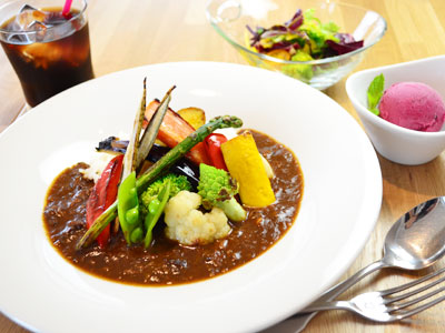 道産食材をふんだんに使ったイタリアンが楽しめるカフェ。お得にいろいろ食べられるランチセットに夏季限定でビーフカレーが登場しました。フォンドボーと長時間煮込んだ牛スジ・スネ肉の旨味が詰まったコク深いルーに、旬の焼き野菜を10種類トッピング。ピリっと辛い夏にぴったりの味わいです。白ワインビネガーを効かせた自家製ドレッシングのサラダと、口の中をスッキリさせてくれるアイスクリームつき。数量限定のセットです。