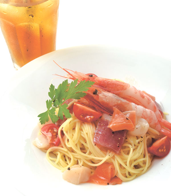 海老、サーモンなどの道産にこだわった魚介類と、アンチョビ・ニンニクがアクセントのパスタを合わせた冷製ペスカトーレがイチオシ。魚介の香りをグッと引き出し、洗練された味わいがクセになる夏季限定メニューです。