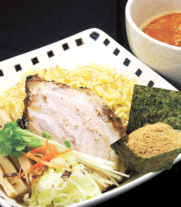 ブラックペッパーとホワイトペッパー、一味とうがらしでパンチを効かせた温つけ麺。具材は、チャーシュー3枚、きくらげ、ネギ、刻み海苔、半熟味玉と納得のボリューム。他、冷やし担々麺(900円)も人気!