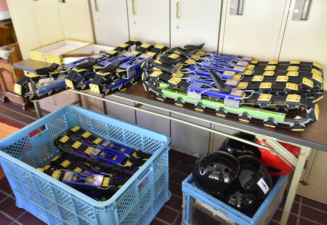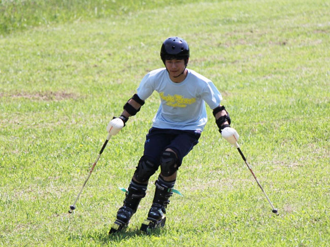 コースはセンターハウス正面に幅40m、全長250mにわたって広がっています。冬スキーのブーツやストックを使い、キャタピラ状のローラーが付いた専用の板に乗りますが、「スキーとは違ってエッジを立てて曲がることはできません。腰ではなく、股関節の傾きと上下の動きでカーブするイメージです」と担当の朝倉雄二さん。冬スキーの感覚はあまり通用しないようですが、「2~3本滑ると慣れますよ」とのこと。レンタルは一式で大人1日3000円(小学生以下2500円)、半日2000円(同1500円)。