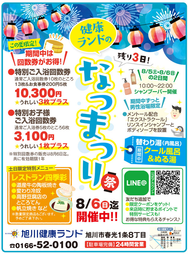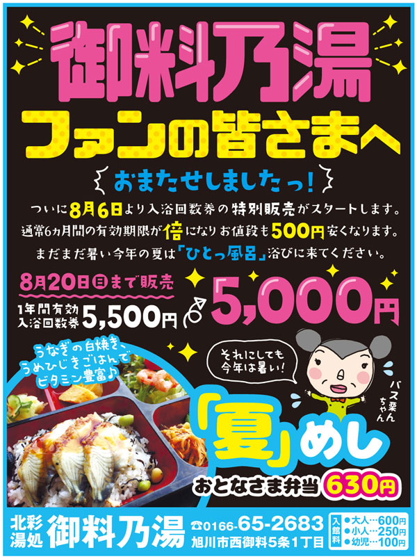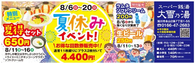 旭川市内の各入浴施設で、夏のイベントが企画されています。変わり湯に、特別メニューなど、お得な情報がたくさん!この機会に入浴回数券を買っておくのもお得かも?!