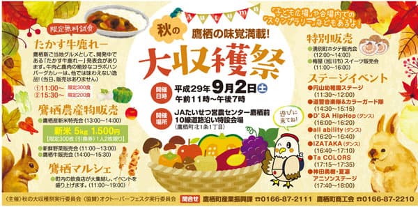 また同日午前11時から午後7時は、JAたいせつ鷹栖営農センター(同北1条1丁目)前で秋の味覚満載の収穫祭も開かれます。農作物販売のほか、開発中のご当地グルメ「たかす牛鹿レー」の無料試食やステージイベントなどお楽しみも。問い合わせは鷹栖町(代表電話0166・87・2111)へ。