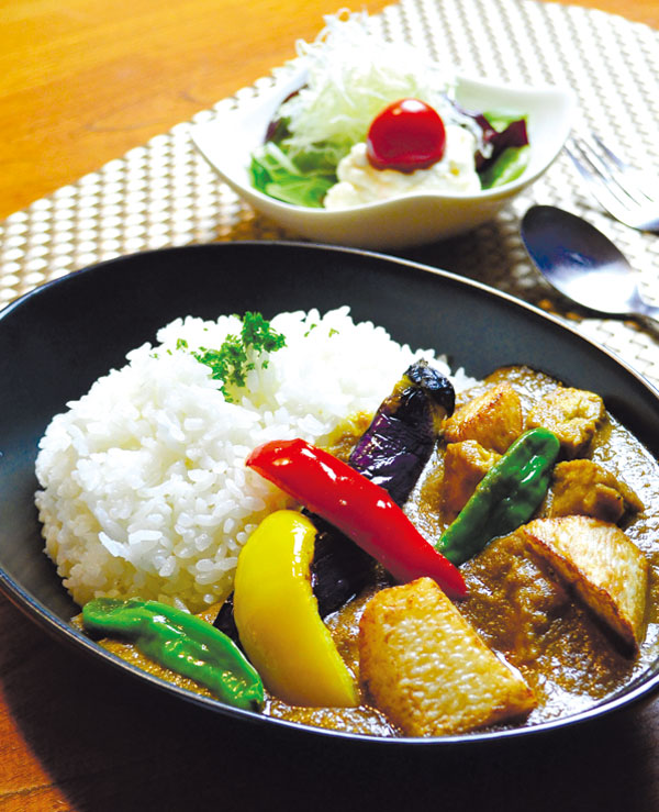 たっぷりの野菜と20種類のスパイスなどを使って6時間かけて作る「野菜とチキンのカレー」は、サラダとドリンクが付いて860円!素揚げした長いもや、ぶつ切りにした鶏肉がごろごろ。